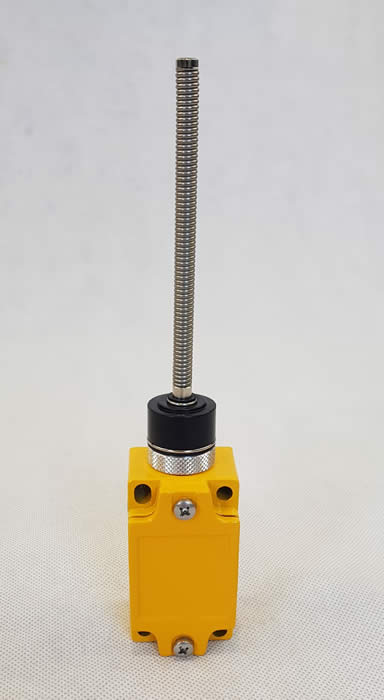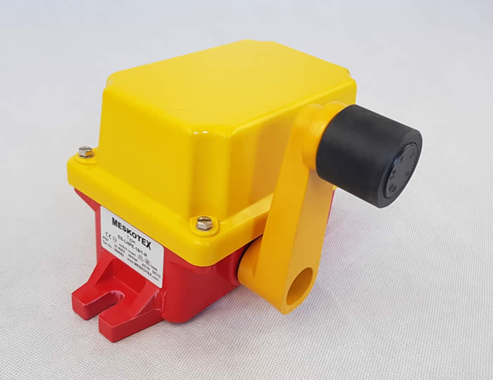 Аварийный тросовый выключатель этого типа предназначен для контроля разрыва транспортерной ленты. Рычаг имеет 2 конечных положения, между которыми он может свободно двигаться. В конечных положениях срабатывают электрические контакты (при нахождении рычага в остальных положениях контакты находятся в нейтральном положении), внутренняя пружина отжимает рычаг в левое конечное положение. Контрольный трос прокладывается под транспортерной лентой и крепится при помощи специального пружинного штекера к рычагу переключателя (рис. 2).